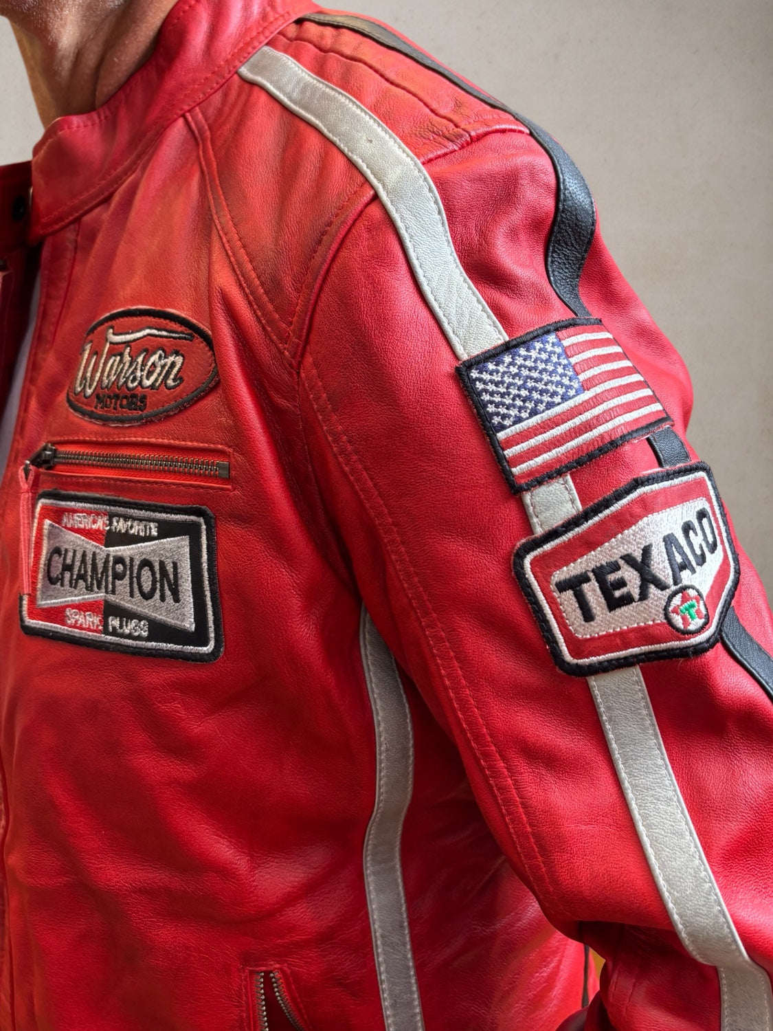 This effortlessly cool racing red leather jacket showcases a lightly washed finish and bold white and black stripes along the sleeves, shoulders, and waist, evoking the spirit of classic motorsport. Adorned with subtly aged Stp patches, it captures the authentic vintage racing vibe of the 80s and 90s.