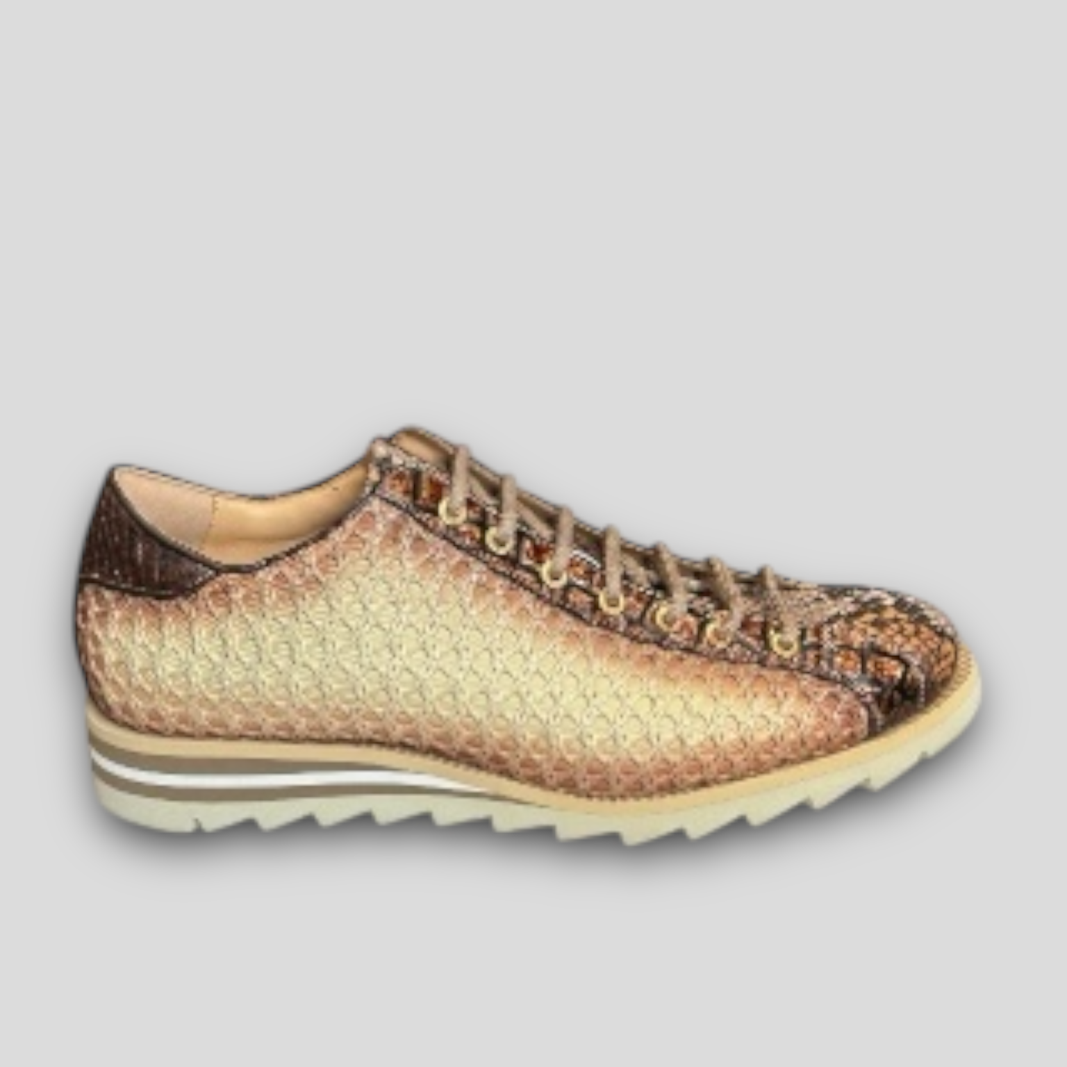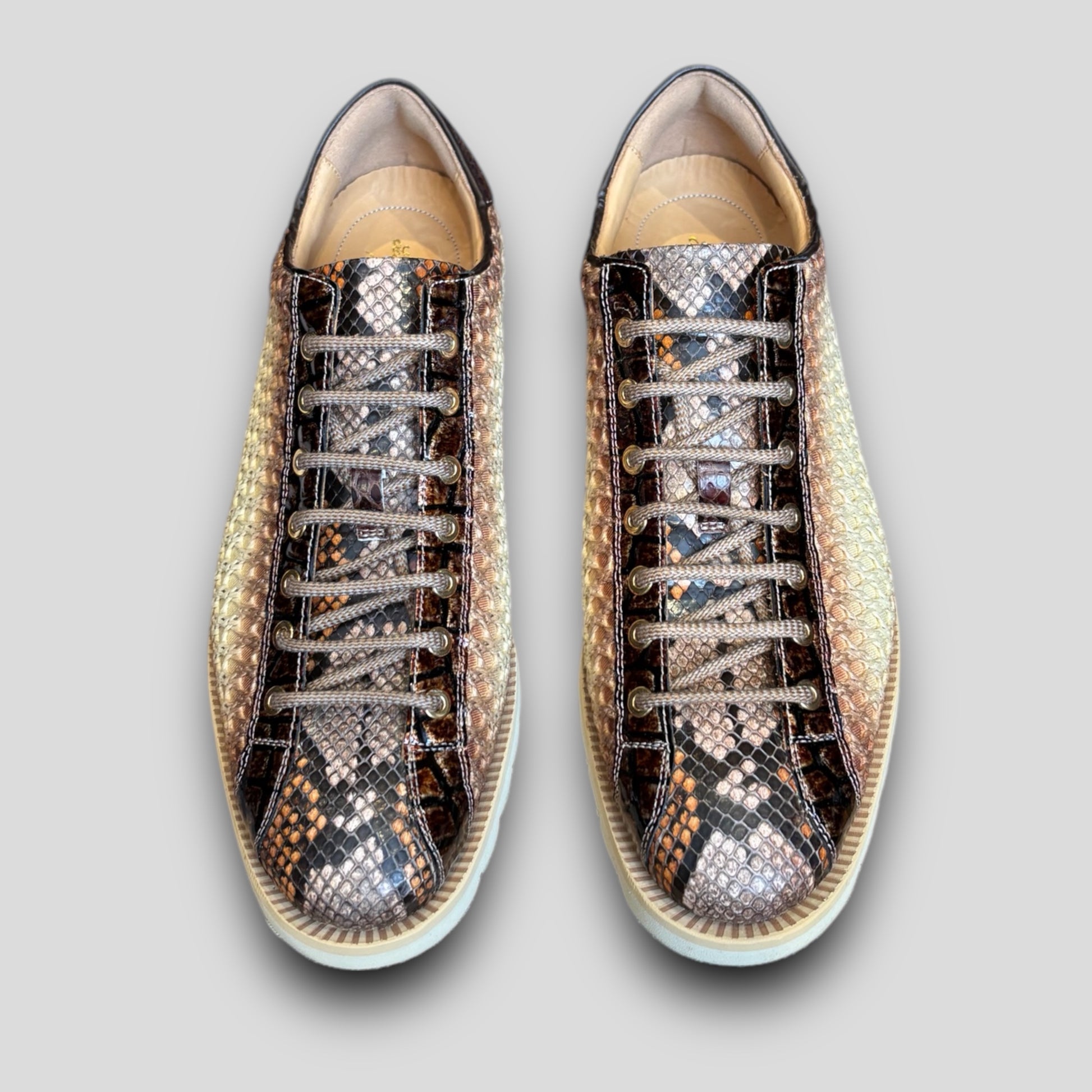 The Mondello sneaker is crafted from genuine calf leather, meticulously hand-painted. Adding to its allure, the sneaker features a shoe tongue and heel counter crafted from luxurious python leather, elevating its sophistication and style.