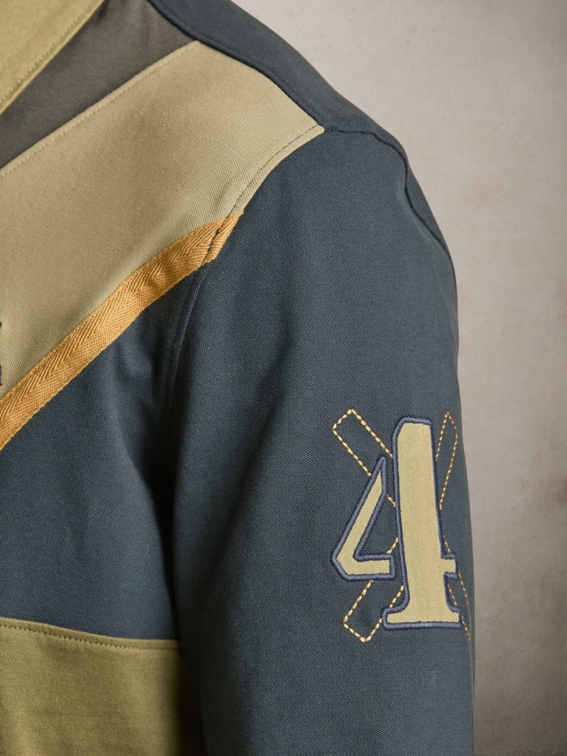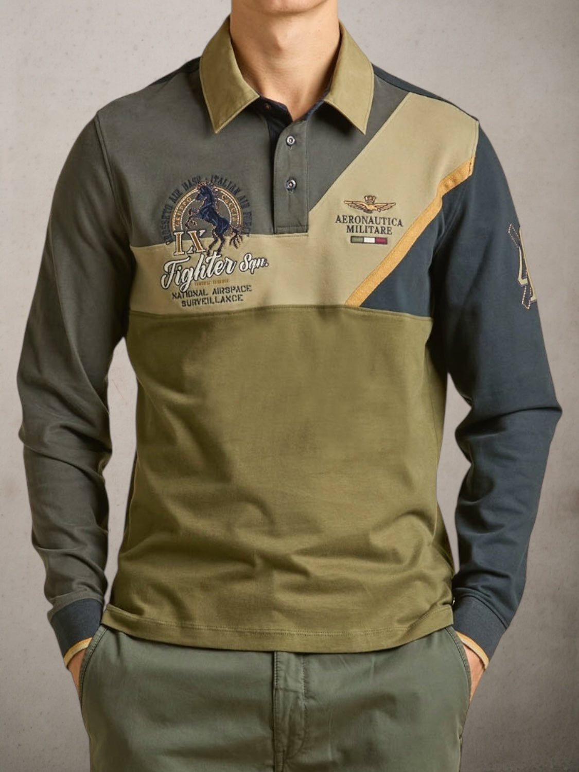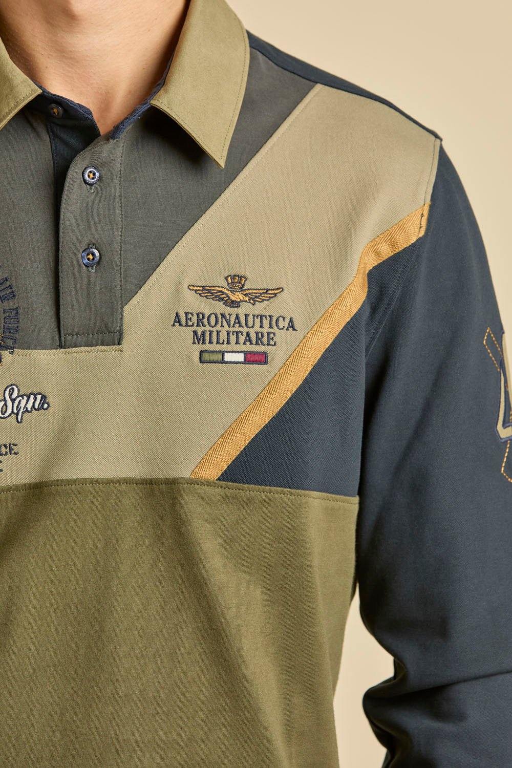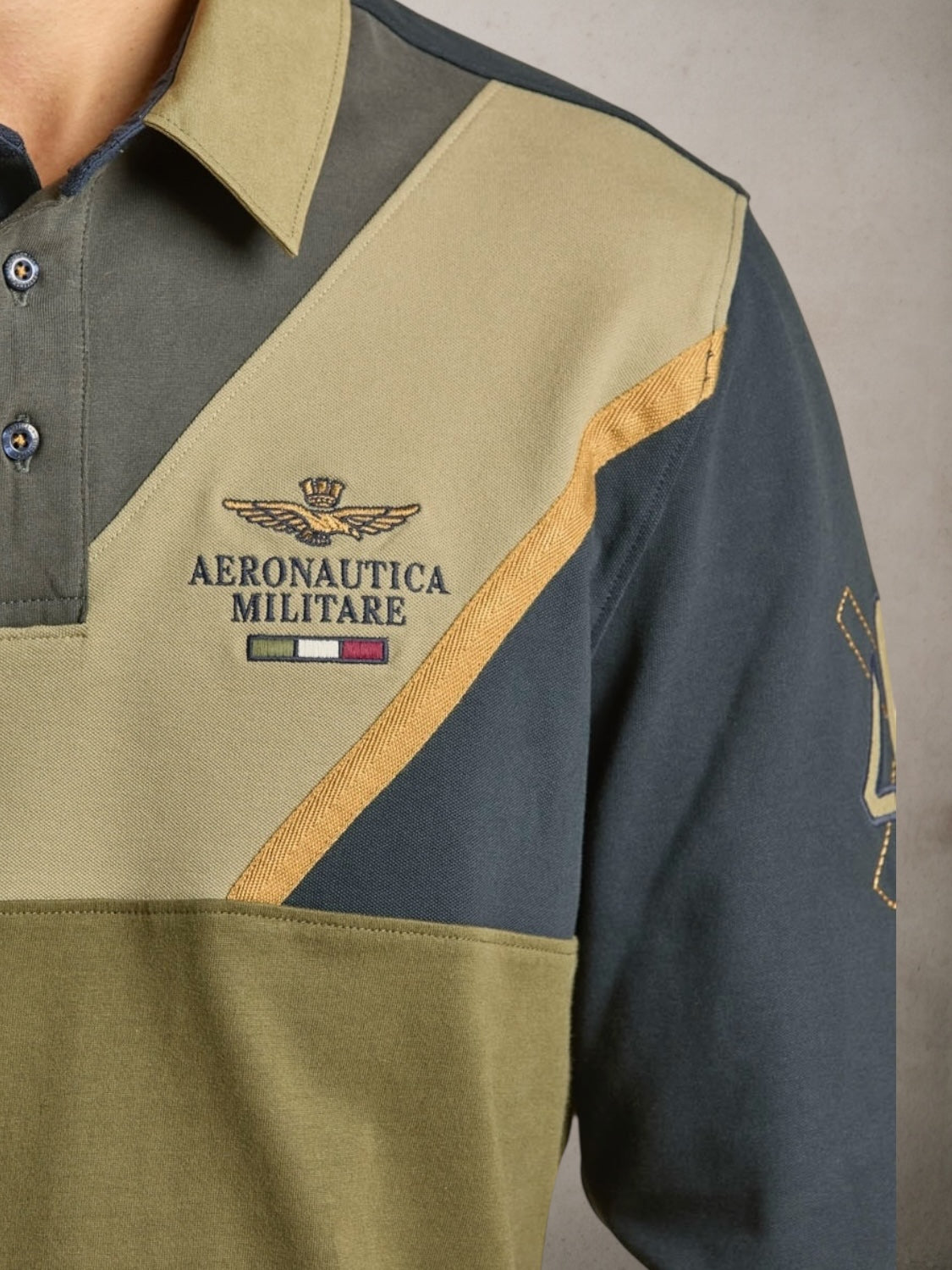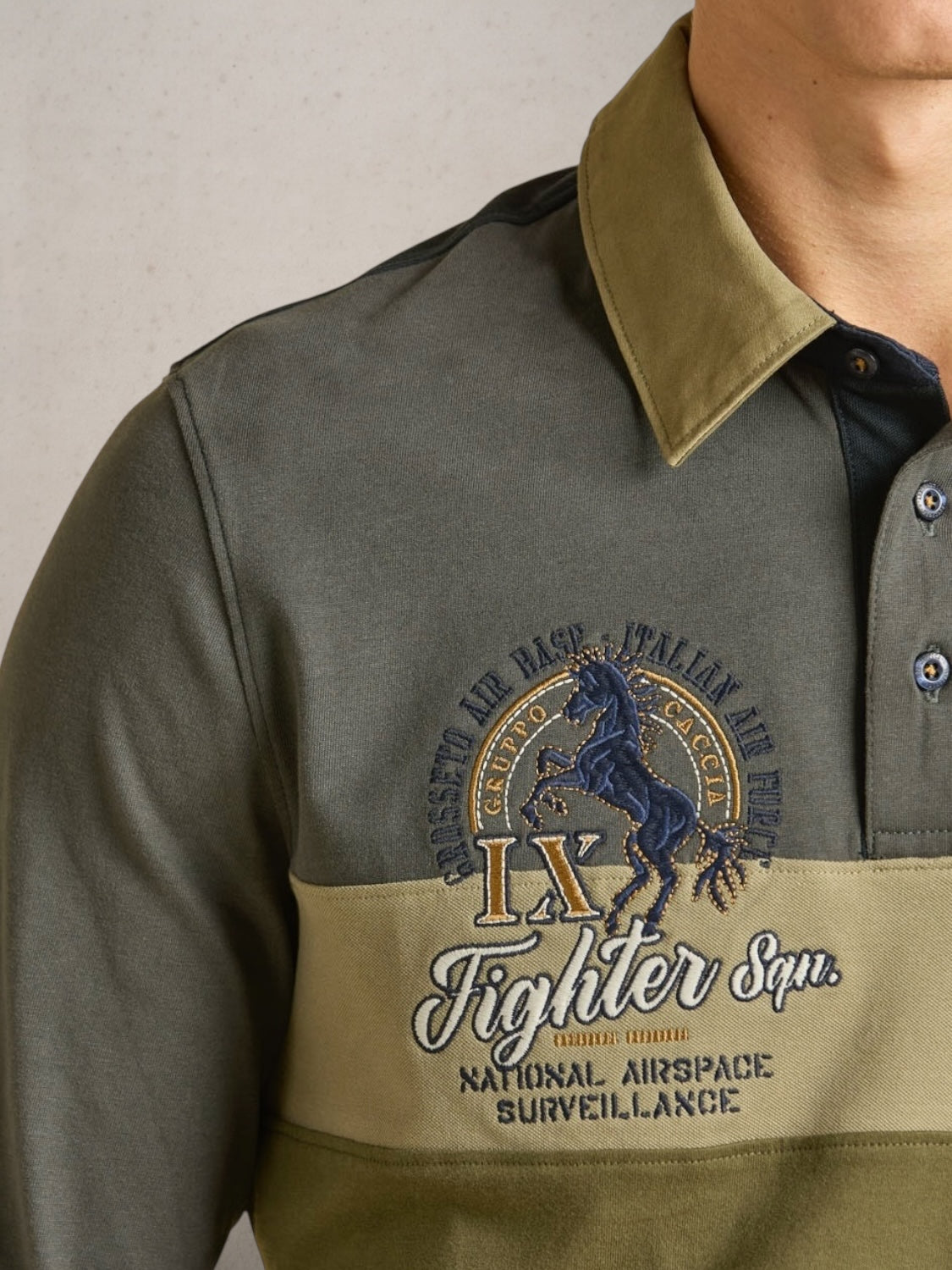 Long-sleeve polo shirt stands out for its bold mix of textures and colors, thanks to a dynamic color-block design that combines stretch cotton piqué with velvety brushed jersey. The contrast between fabrics and tones creates a look full of personality and modern flair. Unique details, like the gabardine collar with printed undercollar, herringbone tape on the chest, and bold embroidery celebrating the historic 9th Fighter Group of the prestigious 4th Wing of the Italian Air Force, make this piece truly distinctive.