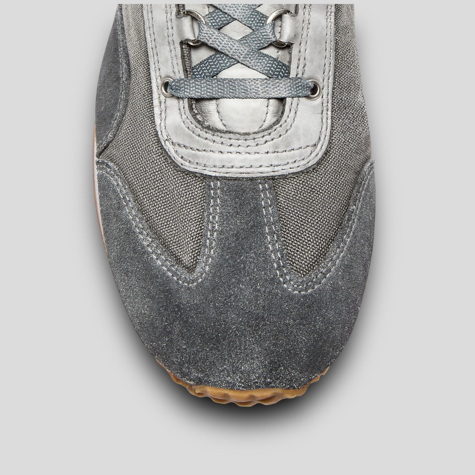 A typical detail of Diadora Heritage sneakers, the stonewash treatment softens the leather