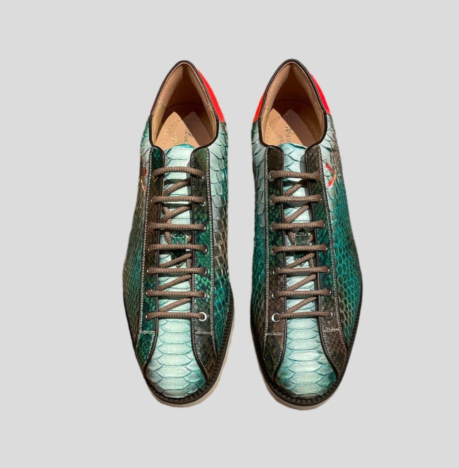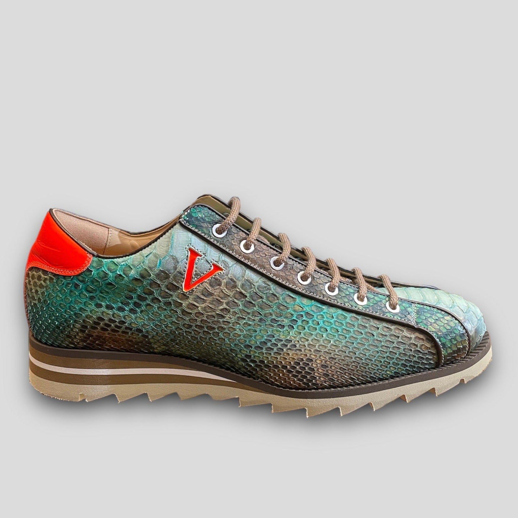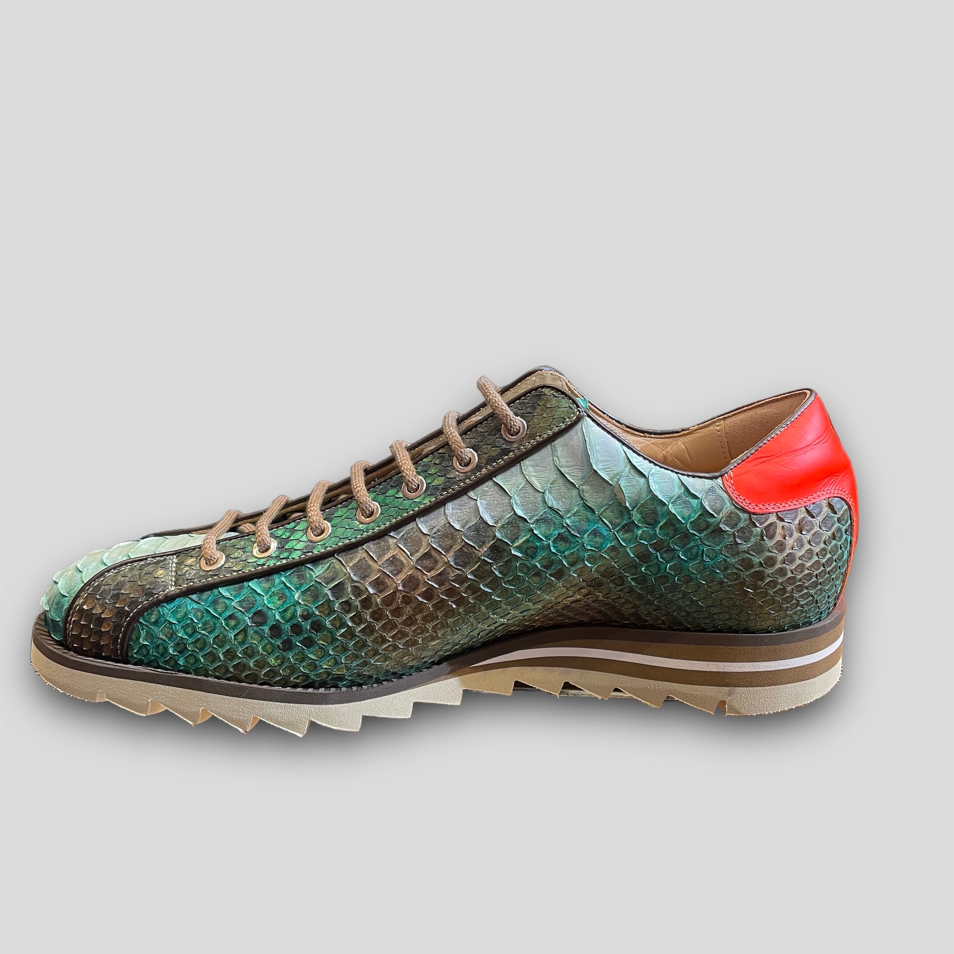 The hand-painted natural python sneaker features a sporty and flexible design, complemented by a rubber sole for enhanced comfort and freedom of movement.
