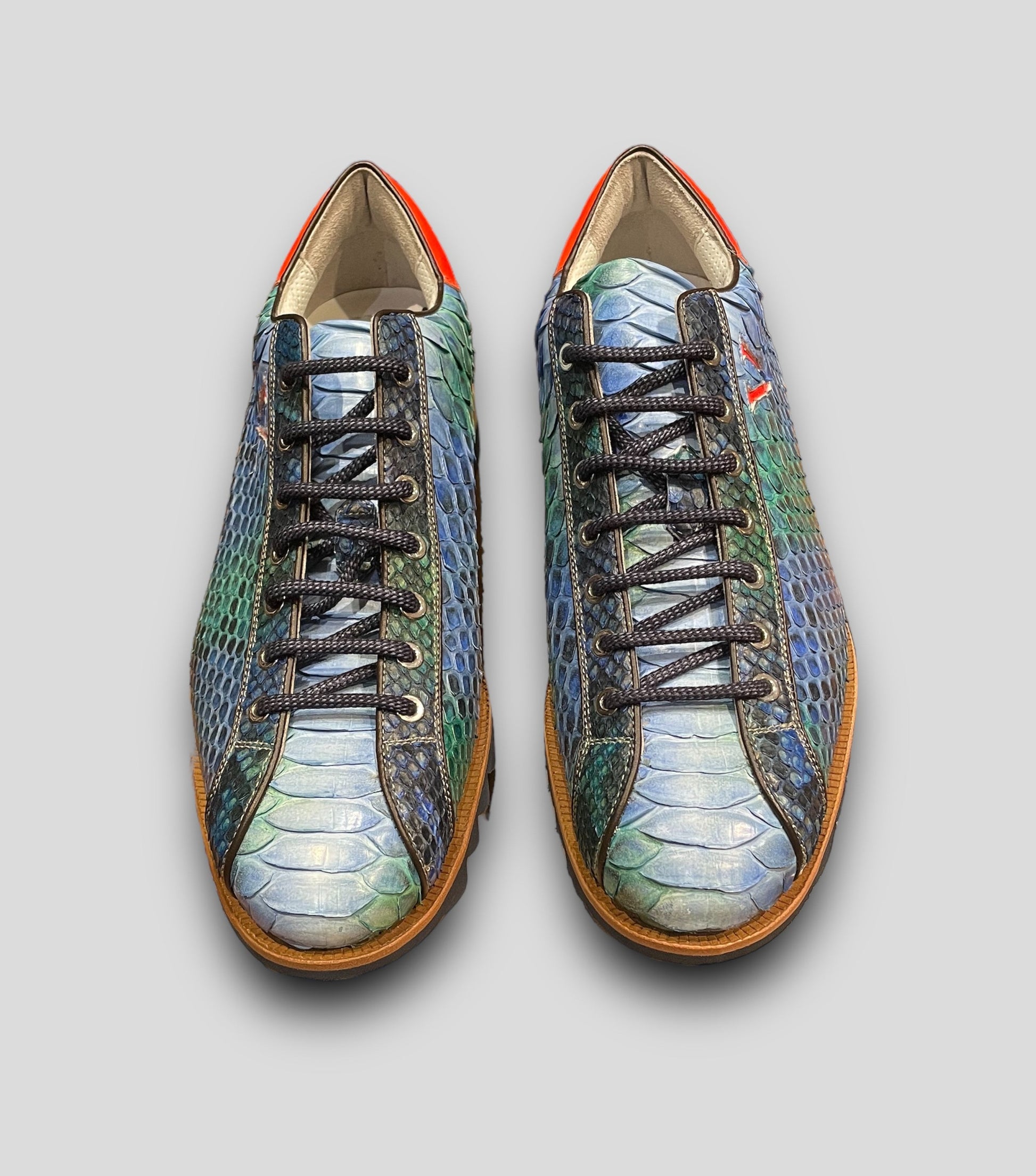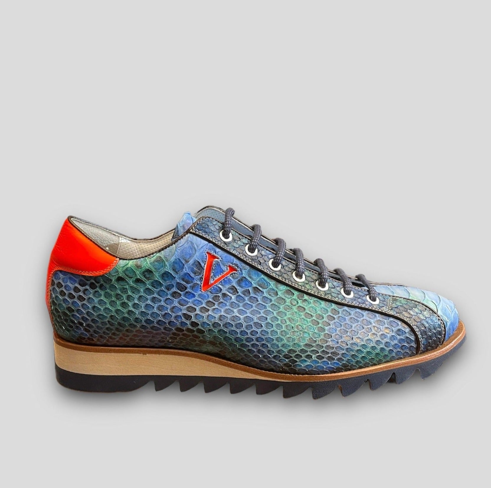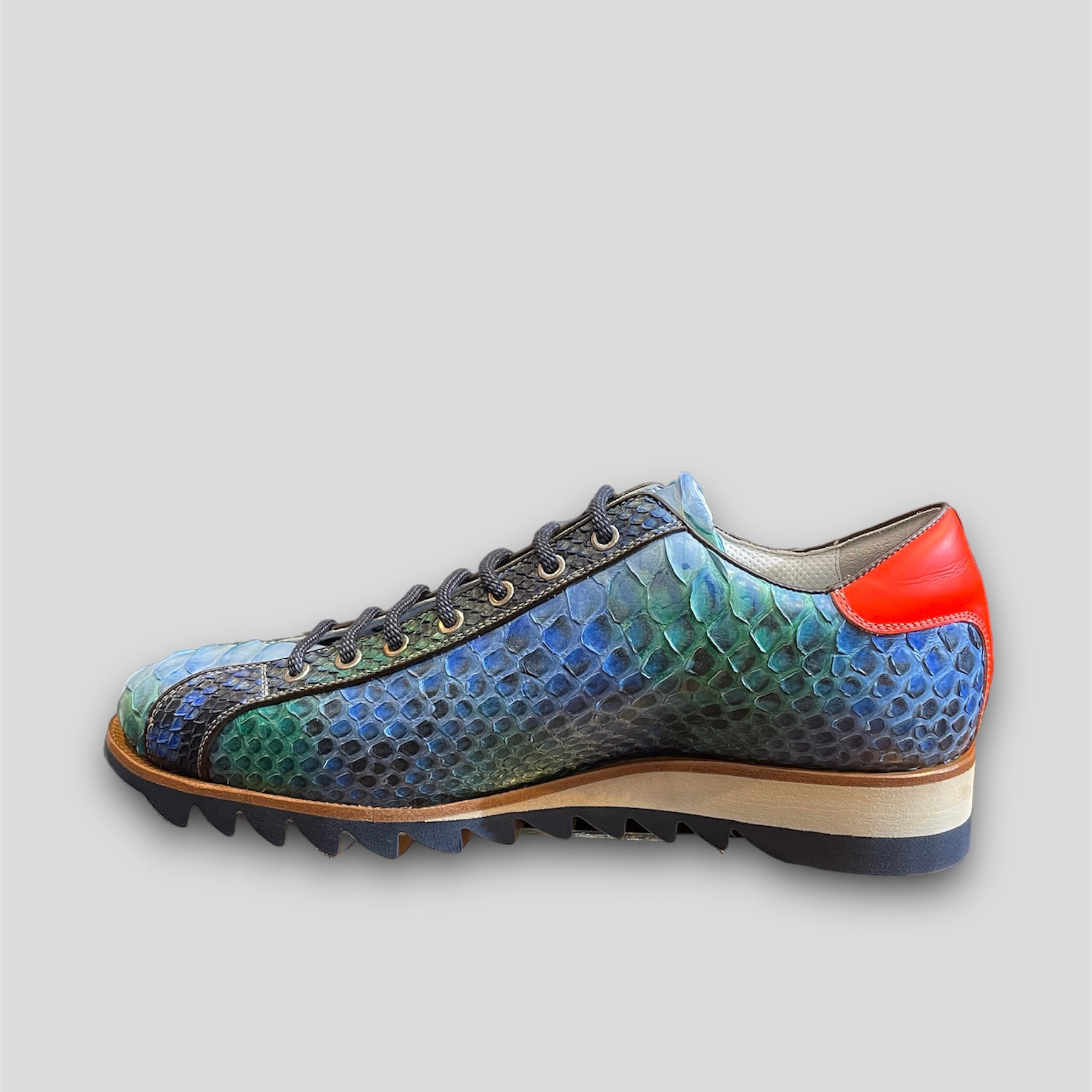 The hand-painted natural python sneaker features a sporty and flexible design, complemented by a rubber sole for enhanced comfort and freedom of movement.