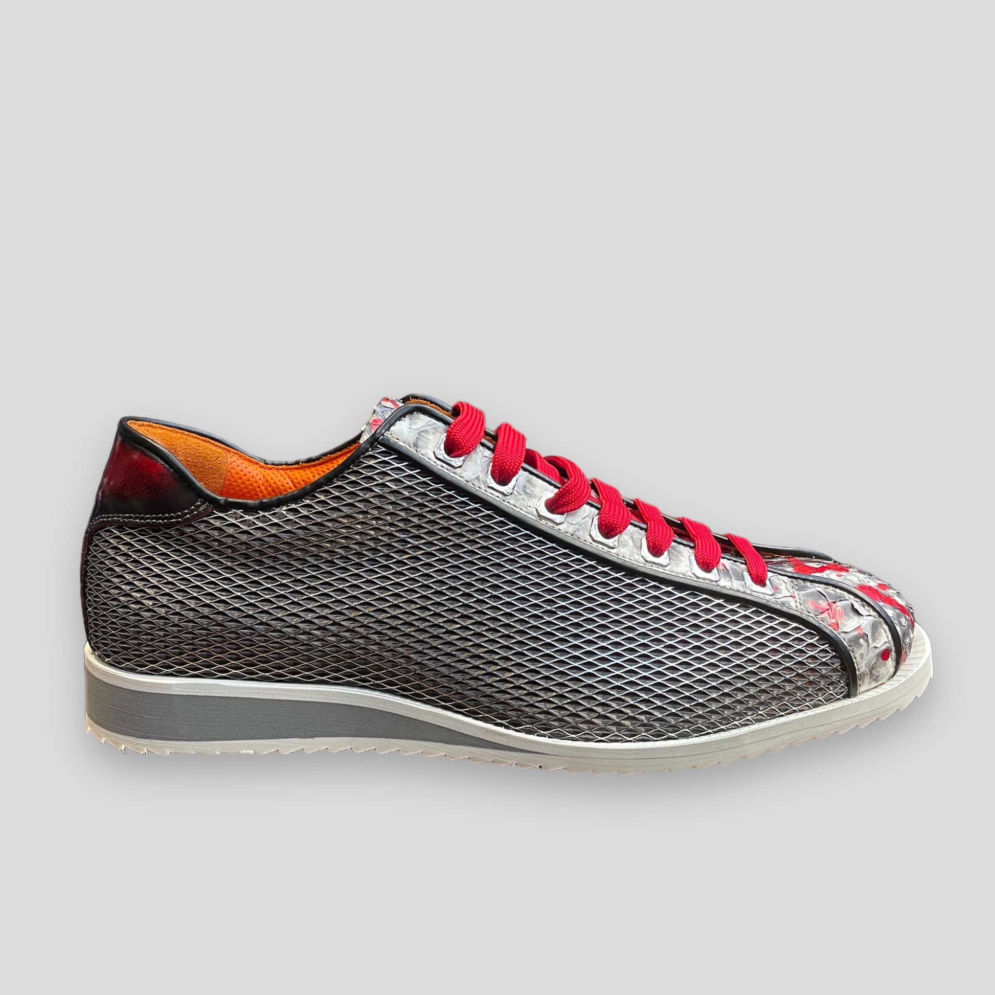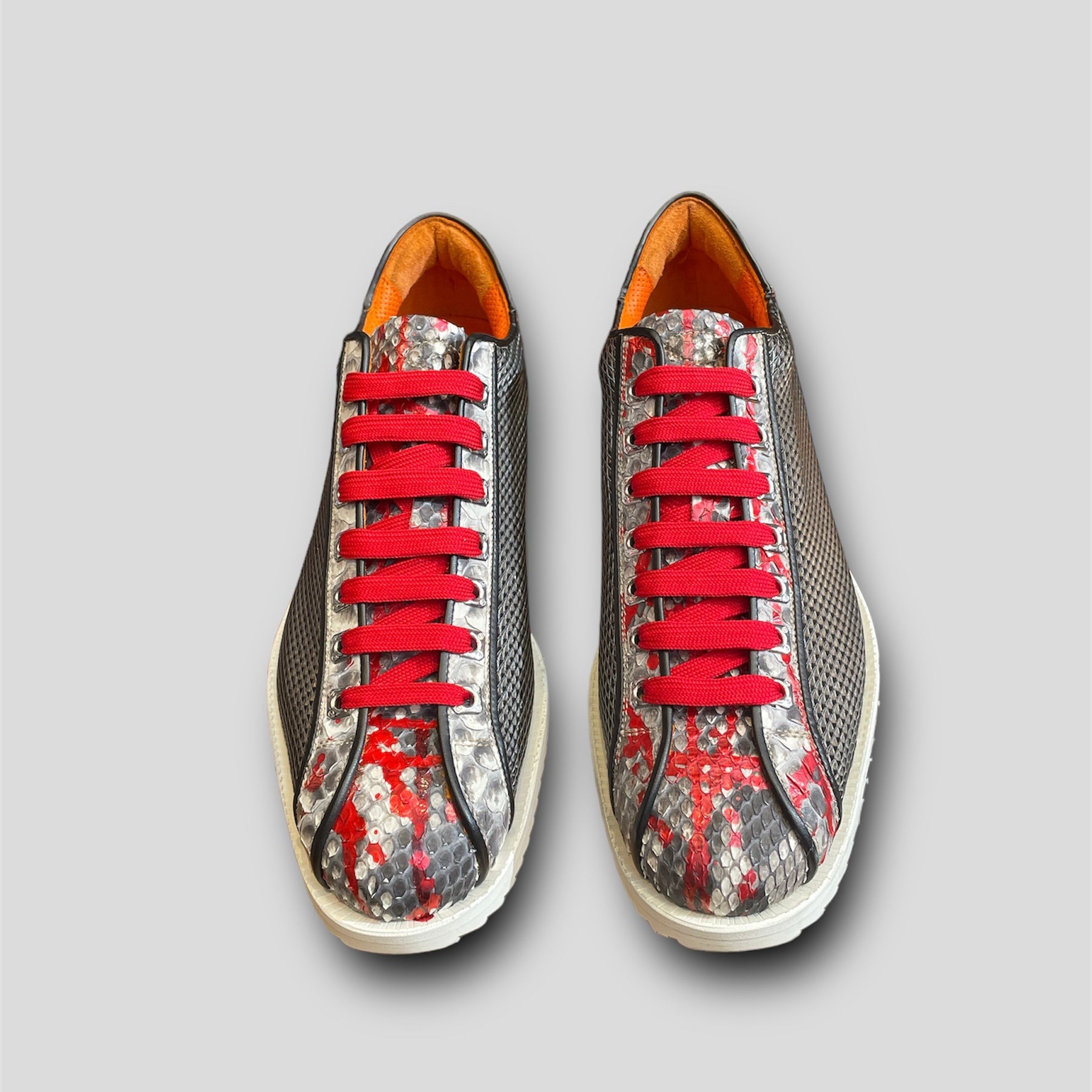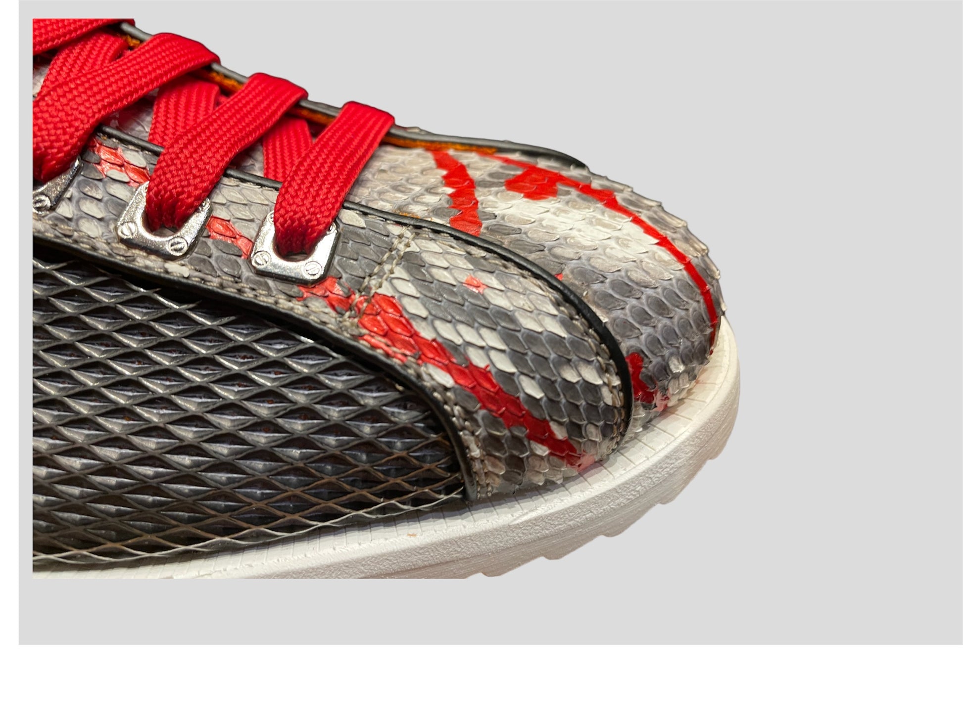 The Scilla sneaker is crafted from natural calf leather in a metallic shade. Adding to its allure, the sneaker features a shoe tongue crafted from luxurious python leather, elevating its sophistication and style.