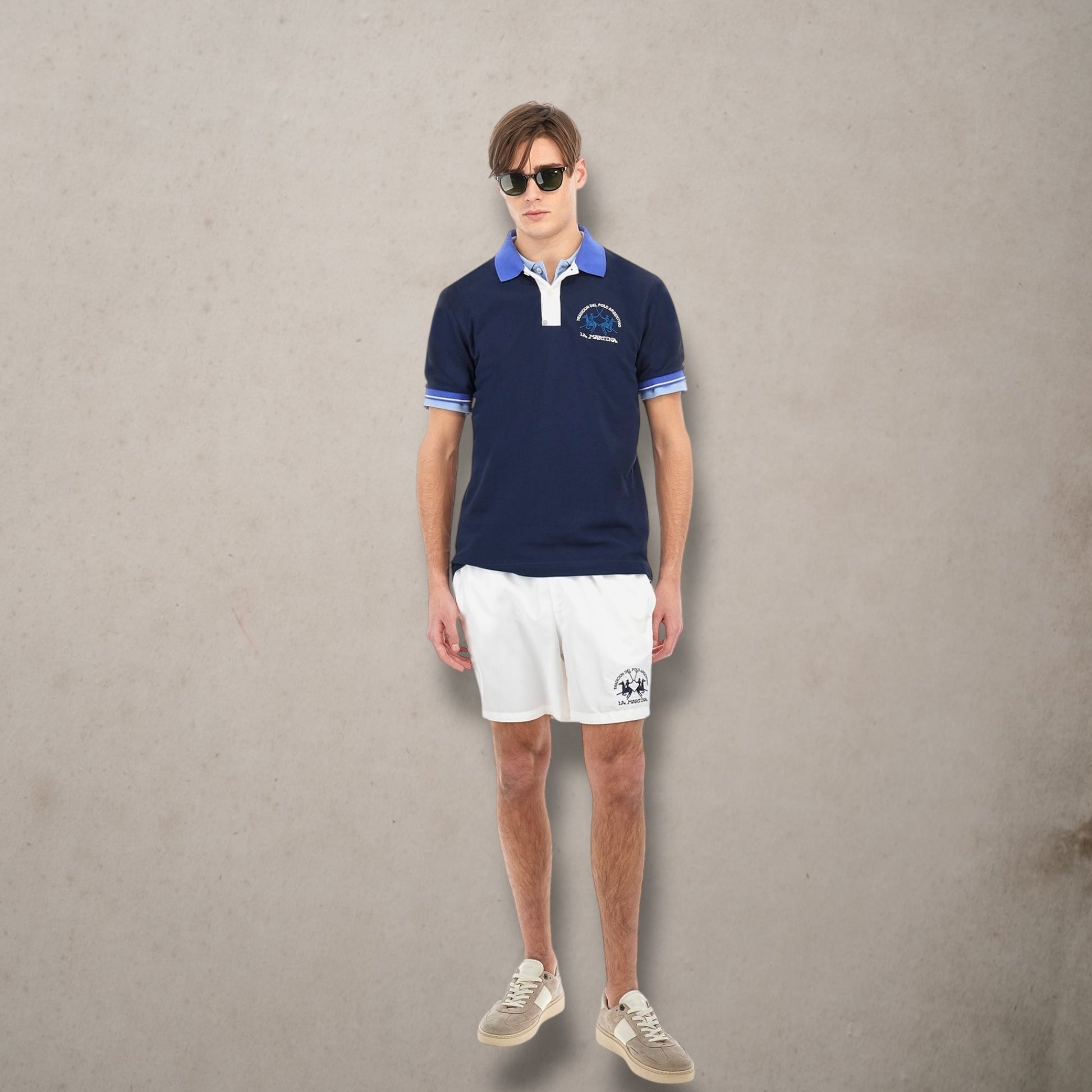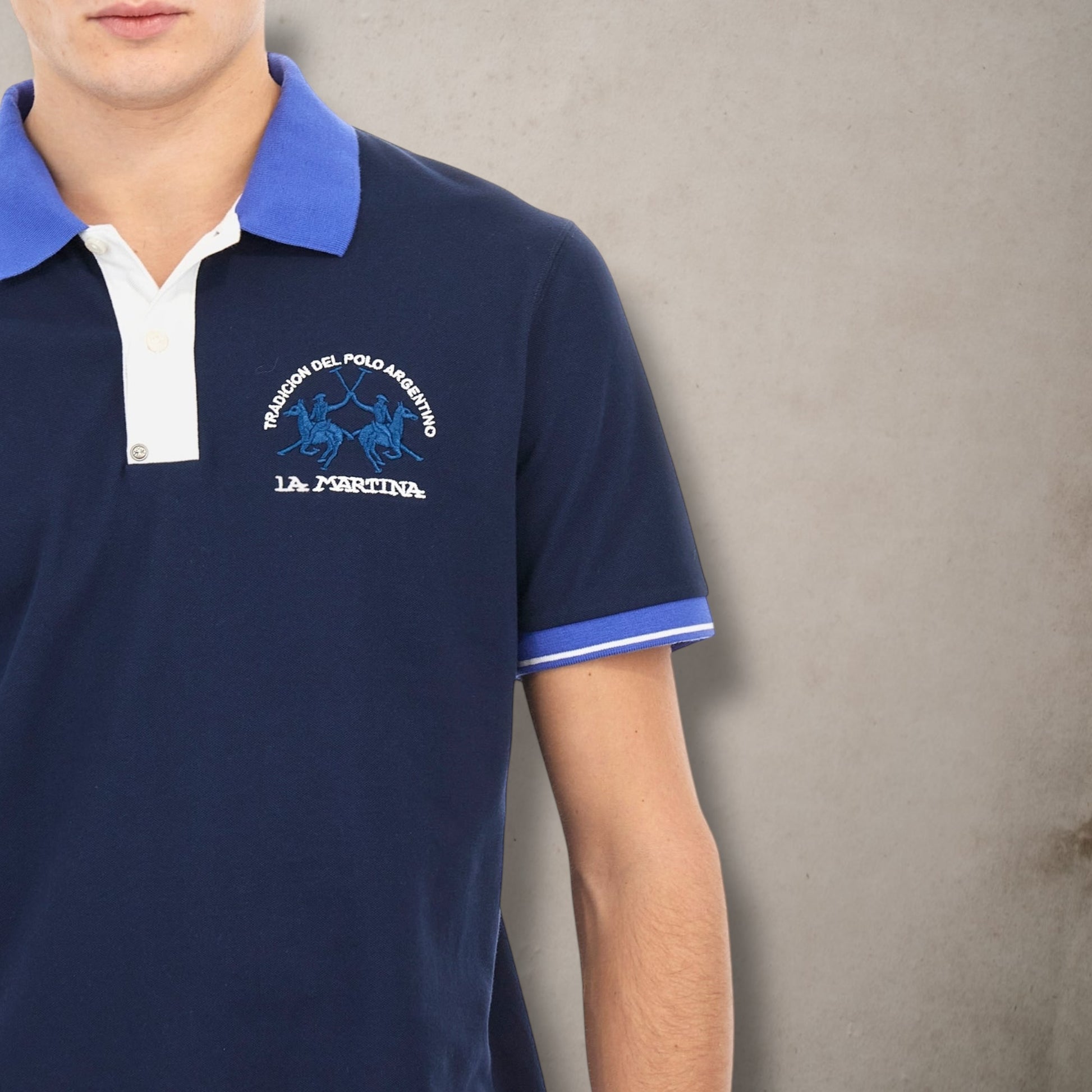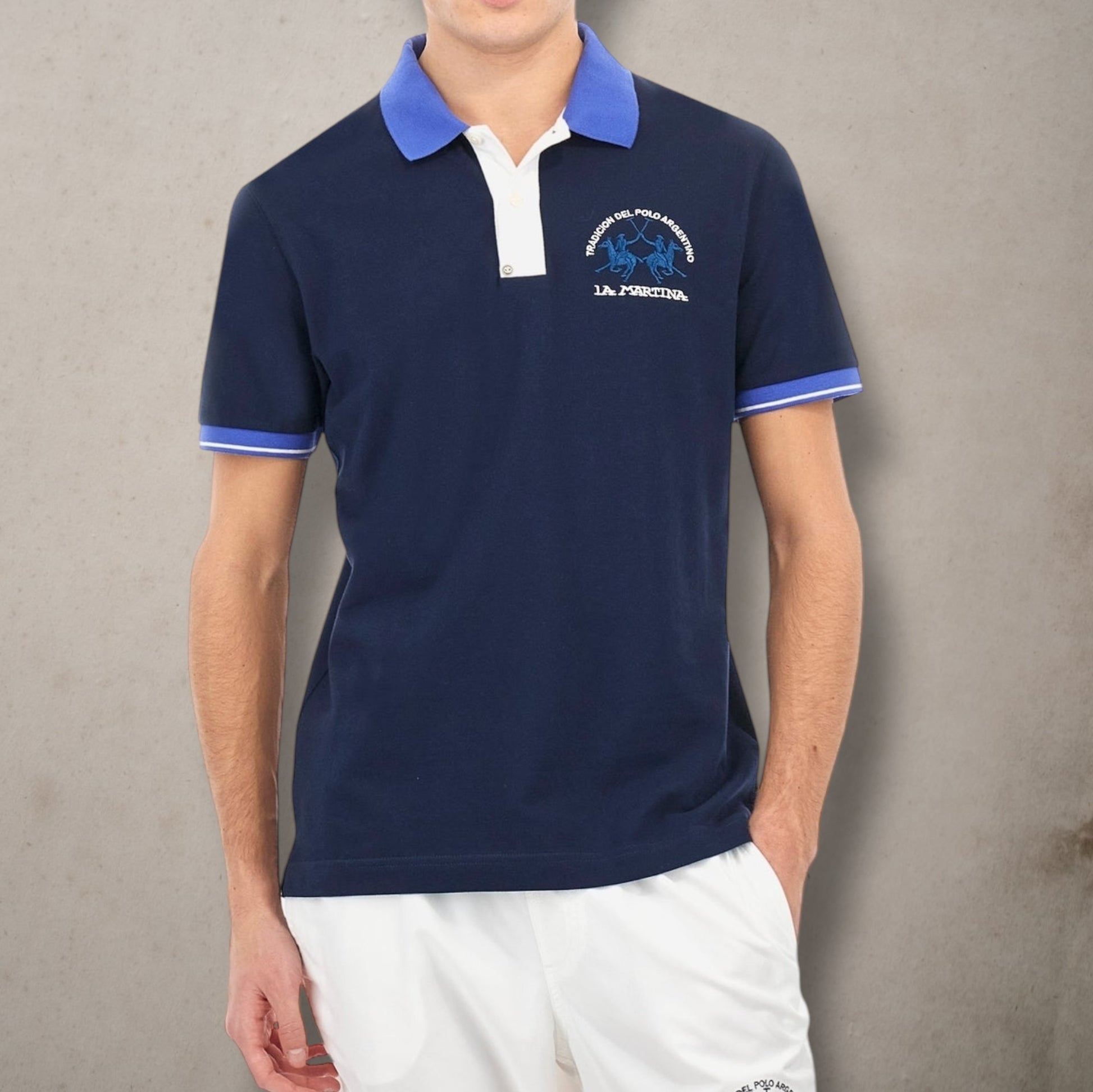 - A contrasting print of La Martina lettering is visible on the undercollar.