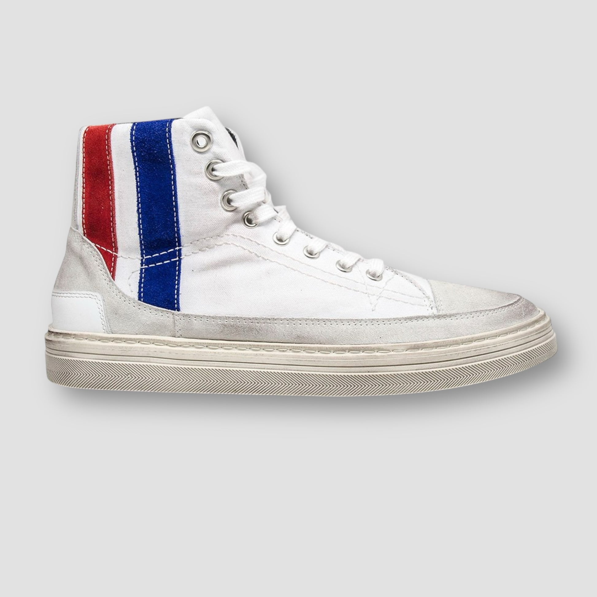 The sole and toe are made of rubber. Front lace closure. It comes with double laces, one white and one orange.